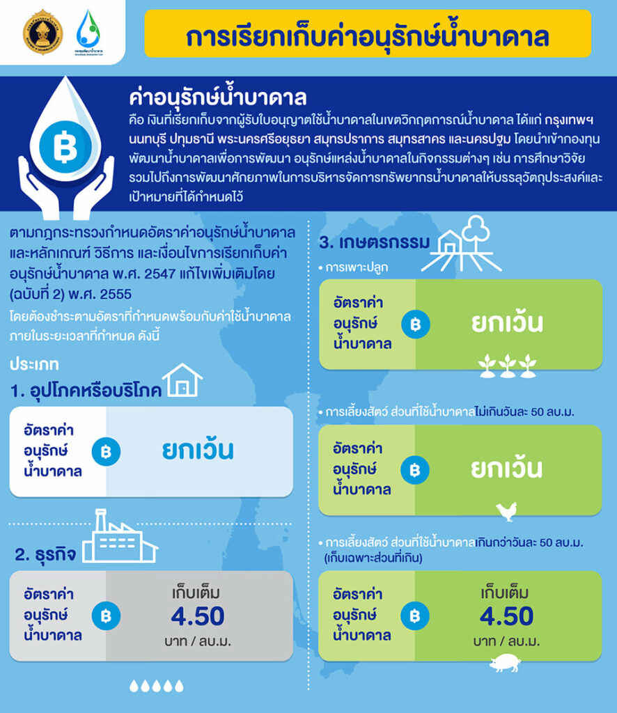 ผู้ใช้น้ำต้องชำระค่าอนุรักษ์น้ำบาดาลอัตราลูกบาศก์เมตรละ 4.50 บาท (สี่บาทห้าสิบสตางค์) ดังนี้
