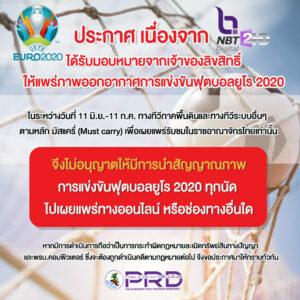 เนื่องจาก สถานีวิทยุโทรทัศน์แห่งประเทศไทย (NBT2HD)ได้รับมอบหมายจากเจ้าของลิขสิทธิ์ให้แพร่ภาพออกอากาศการแข่งขันฟุตบอลยูโร 2020ในระหว่างวันที่11มิ.ย.-11ก.ค.ทางทีวีภาคพื้นดินและทางทีวีระบบอื่นๆ ตามหลัก มัสแครี่(Must carry)เพื่อเผยแพร่รับชมในราชอาณาจักรไทยเท่านั้น จึงไม่อนุญาตให้มีการนำสัญญาณภาพการแข่งขันฟุตบอลยูโร2020ทุกนัดไปเผยแพร่ทางออนไลน์ หรือช่องทางอื่นใด หากมีการดำเนินการถือว่าเป็นการกระทำผิดกฏหมายละเมิดทรัพย์สินทางปัญญา และพรบ.คอมพิวเตอร์ ซึ่งจะต้องถูกดำเนินคดีตามกฏหมายต่อไป