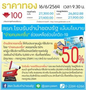 – ด้านอัตราดอกเบี้ย ให้กับประชาชนผู้มาใช้บริการ โดย “จ่ายคนละครึ่ง” ลดดอกเบี้ย 50% แก่ผู้มาใช้บริการที่ถือบัตรสวัสดิการแห่งรัฐ วงเงินจำนำไม่เกิน 5,000 บาท เริ่มตั้งแต่เดือน มิถุนายน – กรกฎาคม 2564 ( 1 คน 1 สิทธิ์ ต่อ 1 รอบตั๋วจำนำ)
