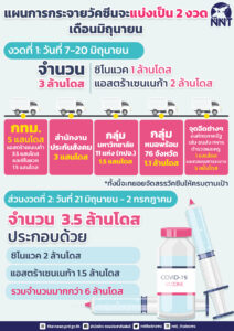 งวดที่ 1 วันที่ 7 – 20 มิถุนายน 2564 จำนวน 3 ล้านโดส (ซิโนแวค 1 ล้านโดส และแอสตร้าเซนเนก้า 2 ล้านโดส)