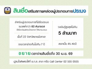 ธ.ก.ส. ได้ขยายเวลาการจ่ายสินเชื่อไปเป็นวันที่ 30 เมษายน 2569 สำหรับคุณสมบัติของผู้ประกอบการประมงที่เข้าร่วมโครงการ เป็นบุคคลธรรมดาอายุไม่ต่ำกว่า 20 ปีบริบูรณ์ มีสัญชาติไทย หรือเป็นนิติบุคคลที่จดทะเบียนตามกฎหมายไทย เป็นผู้มีกรรมสิทธิ์หรือสิทธิครอบครองในเรือประมงที่มีทะเบียนเรือไทย ทั้งประมงพาณิชย์และประมงพื้นบ้าน ที่มีเรือประมงขนาดต่ำกว่า 60 ตันกรอส และมีประสบการณ์ในการประกอบอาชีพประมงมาแล้วไม่น้อยกว่า 1 ปี