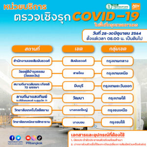 หน่วยบริการตรวจเชิงรุก COVID-19 ในพื้นที่กรุงเทพมหานคร วันที่ 28 – 30 มิถุนายน 2564 ตั้งแต่เวลา 08.00 น. เป็นต้นไป
