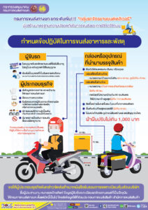 นายจิรุตม์ วิศาลจิตร อธิบดีกรมการขนส่งทางบก กระทรวงคมนาคม เปิดเผยว่า ปัจจุบันธุรกิจรับส่งสินค้า พัสดุภัณฑ์ และอาหาร ได้รับความนิยมอย่างแพร่หลายตามการขยายตัวของธุรกิจร้านค้าบนแพลตฟอร์มดิจิทัล ซึ่งส่วนใหญ่มีการนำรถจักรยานยนต์มาติดตั้งกล่องหรืออุปกรณ์สำหรับบรรจุสินค้าเพื่อใช้ในการขนส่ง จากการสำรวจที่ผ่านมาพบว่าบางคันติดตั้งกล่องหรืออุปกรณ์ที่มีขนาดใหญ่หรือมีความกว้างยื่นจากตัวรถเกินสมควรทำให้ปริมาณหรือน้ำหนักที่บรรทุกส่งผลกระทบต่อความปลอดภัยในการขับขี่ กรมการขนส่งทางบก (ขบ.) ตระหนักถึงความสำคัญของธุรกิจดังกล่าวต่อระบบเศรษฐกิจและสังคม ซึ่งมีส่วนช่วยสร้างงานสร้างรายได้ ขณะเดียวกันก็คำนึงถึงความปลอดภัยของผู้ใช้รถใช้ถนนร่วมกัน จึงกำหนดแนวทางปฏิบัติสำหรับผู้ประกอบธุรกิจรับส่งสินค้าพัสดุภัณฑ์และอาหารด้วยรถจักรยานยนต์ให้เป็นมาตรฐานเดียวกัน ดังนี้