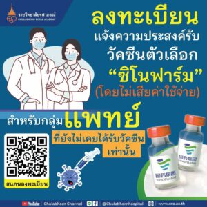 ราชวิทยาลัยจุฬาภรณ์ ขอเชิญกลุ่มแพทย์เข้ารับวัคซีนซิโนฟาร์มกับราชวิทยาลัยจุฬาภรณ์ ฟรี