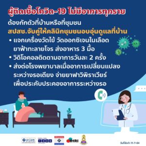การดูแลรักษาที่บ้านหรือ Home Isolation และการดูแลผู้ติดเชื้อโควิด 19 ด้วยระบบชุมชนหรือ Community Isolation ไม่ใช่การทอดทิ้ง เพียงแต่เปลี่ยนสถานที่มาเป็นที่บ้านหรือที่พักอาศัยอื่นๆที่ชุมชนจัดให้ เช่น ศาลาวัด หอประชุมโรงเรียน โดยคลินิกชุมชนอบอุ่นในพื้นที่จะติดต่อไปหาผู้ป่วยภายใน 48 ชั่วโมง และส่งเครื่องวัดไข้ เครื่องวัดระดับออกซิเจนในเลือดไปให้ที่บ้าน ยาฟ้าทะลายโจร แพทย์วิดีโอคอลหาทุกวันเพื่อติดตามประเมินอาการ จัดส่งอาหารให้วันละ 3 มื้อ เพื่อให้ผู้ติดเชื้อสามารถกักตัวอยู่ในบ้านได้อย่างเต็มที่