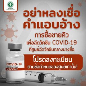 กรมการแพทย์ เตือนอย่าหลงเชื่อการแอบอ้างการซื้อขายคิวฉีดวัคซีนโควิด 19 ที่ศูนย์ฉีดวัคซีนกลางบางซื่อ โปรดลงทะเบียนตามช่องทางที่กำหนดโดยไม่มีค่าใช้จ่ายใด ๆ ทั้งสิ้น