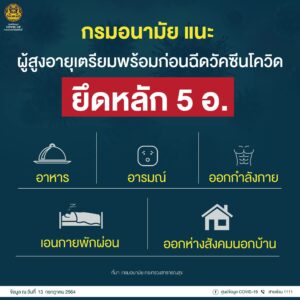 กรมอนามัย แนะนำผู้สูงอายุเตรียมพร้อมก่อนไปฉีดวัคซีนโควิด 19 ด้วยหลัก 5 อ. อย่างต่อเนื่อง