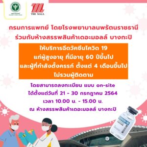 กรมการแพทย์ ร่วมกับห้างสรรพสินค้าเดอะมอลล์ บางกะปิ ให้บริการฉีดวัคซีนโควิด 19 แก่ผู้สูงอายุที่มีอายุ 60 ปีขึ้นไป ข่าวสารกิจกรรม, ข่าวไวรัสโควิด-19 กรมการแพทย์ ร่วมกับห้างสรรพสินค้าเดอะมอลล์ บางกะปิ ให้บริการฉีดวัคซีนโควิด 19 แก่ผู้สูงอายุที่มีอายุ 60 ปีขึ้นไป กรมการแพทย์ โดยโรงพยาบาลนพรัตนราชธานี ร่วมกับห้างสรรพสินค้าเดอะมอลล์ บางกะปิ ให้บริการฉีดวัคซีนโควิด 19 แก่ผู้สูงอายุที่มีอายุ 60 ปีขึ้นไป และผู้ที่กำลังตั้งครรภ์ตั้งแต่ 4 เดือนขึ้นไป ไม่รวมผู้ติดตาม โดยสามารถลงทะเบียน แบบ on-site ได้ตั้งแต่วันที่ 21 – 30 กรกฎาคม 2564 เวลา 10.00 น. – 15.00 น. ณ ห้างสรรพสินค้าเดอะมอลล์ บางกะปิ ที่มา : https://bit.ly/2V1rbAy Post Views: 62 FacebookFacebookXTwitterLINELine
