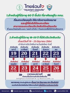- สำหรับผู้ที่มีอายุ 60 ปีขึ้นไป ที่อาศัยอยู่ในกรุงเทพมหานครที่ลงทะเบียนเเล้วให้มาฉีดตามนัดหมายและผู้ที่ยังไม่ได้ลงทะเบียนสามารถลงทะเบียนฉีดวัคซีนได้เหมือนเดิมได้ที่ : www.ไทยร่วมใจ.com แอพพลิเคชั่นเป๋าตัง และ ร้านสะดวกซื้อที่เข้าร่วมโครงการ