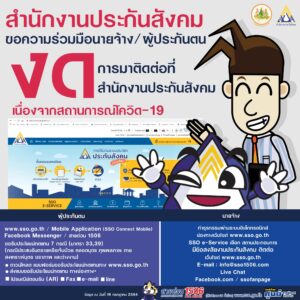 สำนักงานประกันสังคม ขอความร่วมมือนายจ้าง ลูกจ้าง ผู้ประกันตน งดการมาติดต่อที่สำนักงานประกันสังคมในระยะนี้ โดยให้ติดต่องานหรือทำธุรกรรมผ่านช่องทางอิเล็กทรอนิกส์ SSO e-Service หรือระบบออนไลน์ เพื่อลดความเสี่ยงในการแพร่ระบาดของโรคโควิด 19