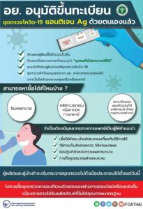 อย.อนุมัติขึ้นทะเบียนชุดตรวจโควิด 19 แบบตรวจหาแอนติเจนด้วยตนเองแล้ว ประชาชนสามารถซื้อได้ผ่านสถานพยาบาล หน่วยงานของรัฐ และร้านขายยาที่มีเภสัชกรให้คำแนะนำ ขอให้ผู้บริโภคสังเกตข้อความบนฉลาก “บุคคลทั่วไปสามารถใช้ได้” สามารถตรวจสอบชุดตรวจที่ได้รับอนุญาตจาก อย. ได้ทางเว็บไซต์กองควบคุมเครื่องมือแพทย์