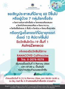 คณะแพทยศาสตร์โรงพยาบาลรามาธิบดี ขอเชิญผู้ที่อายุ 60 ปีขึ้นไป หรือผู้ป่วย 7 กลุ่มโรคเรื้อรัง ฉีดวัคซีนโควิด 19 เข็มที่ 1