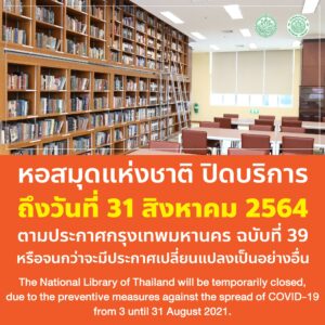 สำนักหอสมุดแห่งชาติ แจ้งปิดบริการ ตั้งแต่บัดนี้ – 31 สิงหาคม 2564 ตามประกาศกรุงเทพมหานคร ฉบับที่ 39 หรือจนกว่าจะมีประกาศเปลี่ยนแปลงเป็นอย่างอื่ เพื่อป้องกันการแพร่ระบาดของโรคติดเชื้อ COVID-19