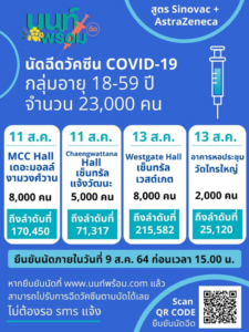 • ติดต่อแก้ไขข้อมูลเพื่อยืนยันนัดได้ที่ ศูนย์สื่อสารความเสี่ยงโควิด 19 สำนักงานสาธารณสุขจังหวัด นนทบุรี โทร. 061 394 5402 / 061 172 2534 / 061 174 2260 / 061 394 5403