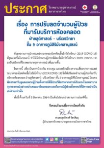 ในการนี้ เพื่อเป็นการป้องกัน ควบคุม และหลีกเลี่ยงความเสี่ยงจากการแพร่ระบาดของโรคติดเชื้อไวรัสโคโรนา 2019 จึงให้ปรับลดจำนวนผู้ป่วยที่มารับบริการห้องคลอด ฝ่ายสูติศาสตร์ – นรีเวชวิทยา ชั้น 9 อาคารภูมิสิริมังคลานุสรณ์ โดยขอพิจารณารับดูแลเฉพาะผู้ป่วยตั้งครรภ์ที่มีประวัติการฝากครรภ์กับทางโรงพยาบาลจุฬาลงกรณ์อย่างสม่ำเสมอมาโดยตลอด และในกรณีผู้ป่วยตั้งครรภ์ที่มีความจำเป็นเร่งด่วนเท่านั้น