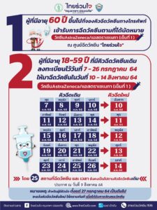 ไทยร่วมใจ กรุงเทพฯ ปลอดภัย Safe Bangkok แจ้งให้ผู้สูงอายุ 60 ปี ที่จองคิวฉีดวัคซีนทางโทรศัพท์ เข้ารับการฉีดวัคซีน AstraZeneca เข็มที่ 1 ณ ศูนย์ฉีดวัคซีนไทยร่วมใจตามที่ได้นัดหมาย สำหรับผู้ที่มีอายุ 18 – 59 ปี ที่มีคิวฉีดวัคซีนเดิม ลงทะเบียนไว้วันที่ 7 – 26 กรกฎาคม 2564 ให้มาฉีดวัคซีน AstraZeneca เข็มที่ 1ในวันที่ 10 – 14 สิงหาคม 2564 ดังนี้