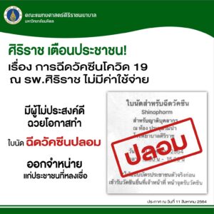 การนี้ มีผู้ไม่ประสงค์ดีฉวยโอกาสจัดทำใบนัดสำหรับฉีดวัคซีนปลอม พร้อมเรียกเก็บค่าใช้จ่ายในการฉีดวัคซีน ณ รพ.ศิริราช กรณีดังกล่าวรพ.ศิริราชมีความห่วงใยประชาชน หากมีการเรียกเก็บค่าใช้จ่ายสำหรับใบนัดฉีดวัคซีน กรุณาอย่าหลงเชื่อ เพราะเมื่อท่านมาที่โรงพยาบาลศิริราชด้วยใบนัดฉีดวัคซีนปลอม ท่านก็จะไม่ได้รับการฉีดวัคซีนใด ๆ ทั้งสิ้น