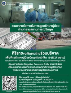 โรงพยาบาลศิริราช ขอเชิญชวนคนไทยร่วมบริจาค เพื่อจัดสร้างหอผู้ป่วยวิกฤตโรคโควิด 19 (ICU สนาม) , ห้องความดันลบ Negative Pressure 2 หลัง รวม 20 เตียง , เครื่องมือทางการเเพทย์ ยาเเละเวชภัณฑ์สำหรับผู้ป่วยวิกฤต , พร้อมระบบความปลอดภัยของผู้ป่วยเเละบุคลากร