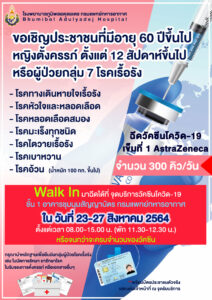 โรงพยาบาลภูมิพลอดุลยเดช เชิญชวนประชาชนที่มีอายุ 60 ปีขึ้นไป ผู้ป่วยกลุ่ม 7 โรคเรื้อรัง หรือหญิงตั้งครรภ์ 12 สัปดาห์ขึ้นไป Walk in ฉีดวัคซีนโควิด 19 เข็มที่ 1 AstraZeneca (รับวันละ 300 คิว) ตั้งแต่วันที่ 23 – 27 สิงหาคม 2564 เวลา 08.00 – 15.00 น. (พัก 11.30 – 12.30 น.) ณ จุดบริการวัคซีนโควิด 19 ชั้น 1 อาคารชุมนุมสัญญาบัตร