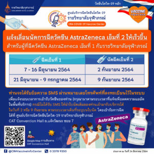 ผู้ที่ฉีดเข็มที่ 1 ช่วงวันที่ 21 มิถุนายน – 9 กรกฎาคม 2564 นัดฉีดเข็มที่ 2 วันที่ 9 กันยายน 2564