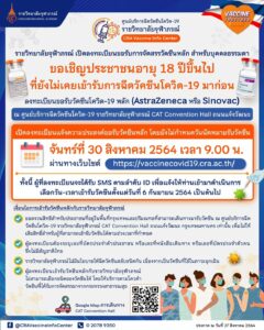 ขอสงวนสิทธิสำหรับประชาชนที่อยู่ในพื้นที่กรุงเทพและปริมณฑลที่สามารถเดินทางมารับวัคซีน ณ ศูนย์บริการฉีดวัคซีนโควิด 19 ราชวิทยาลัยจุฬาภรณ์ CAT Convention Hall ถนนแจ้งวัฒนะ กรุงเทพมหานคร เท่านั้น เพื่อไม่ให้เสียสิทธิ์สำหรับผู้ที่สามารถเข้ารับวัคซีนได้ตามช่วงเวลาที่กำหนด