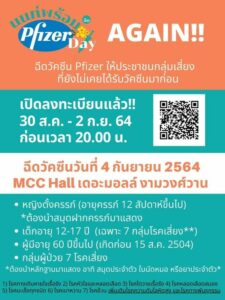 นนท์พร้อม เปิดลงทะเบียนฉีดวัคซีน Pfizer เพิ่ม วันที่ 30 สิงหาคม – 2 กันยายน 2564 ลงทะเบียนได้ที่ https://นนท์พร้อม.com/nontprompt/ ฉีดวัคซีนที่ MCC Hall เดอะมอลล์ งามวงศ์วาน วันที่ 4 กันยายน 2564 จำนวน 8,000 คน