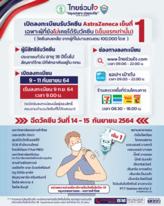 ไทยร่วมใจ เปิดลงทะเบียนรับวัคซีน AstraZeneca เข็มที่ 1 เริ่มลงทะเบียนวันที่ 9 กันยายน 2564