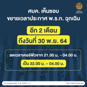ศบค. เห็นชอบขยายเวลาประกาศ พ.ร.ก.ฉุกเฉินอีก 2 เดือน ถึงวันที่ 30 พ.ย. 64 ข่าวสารกิจกรรม, ข่าวไวรัสโควิด-19 ศบค. เห็นชอบขยายเวลาประกาศ พ.ร.ก.ฉุกเฉินอีก 2 เดือน ถึงวันที่ 30 พ.ย. 64 ศูนย์บริหารสถานการณ์แพร่ระบาดของโรคติดเชื้อไวรัสโคโรนา 2019 เห็นชอบขยายเวลาประกาศ พ.ร.ก.ฉุกเฉินอีก 2 เดือน ถึงวันที่ 30 พฤศจิกายน 2564 ลดเวลาเคอร์ฟิว จาก 21.00 – 04.00 น. เป็น 22.00 – 04.00 น. เริ่มวันที่ 1 ตุลาคม 2564 (อย่างน้อย 15 วัน และจะประเมินสถานการณ์อีกครั้ง) ที่มา : https://bit.ly/3kLYRwD Post Views: 79 FacebookFacebookXTwitterLINELine