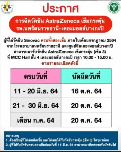 กรมการแพทย์ ประกาศการให้บริการฉีดวัคซีนแอสตร้าเซนเนกา เข็มกระตุ้น สำหรับผู้ที่ได้รับวัคซีนซิโนแวคครบทั้ง 2 เข็ม ภายในเดือนกรกฎาคม 2564 จาก โรงพยาบาลนพรัตนราชธานี และศูนย์ฉีดเดอะมอลล์บางกะปิ สามารถเข้ารับวัคซีนแอสตร้าฯ เข็มกระตุ้น ที่ MCC Hall ชั้น4 เดอะมอลล์บางกะปิ เวลา 10.00- 15.00 น.