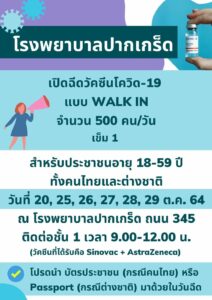 โรงพยาบาลปากเกร็ด เปิดฉีดวัคซีนแบบ Walk In สำหรับประชาชนอายุ 18 – 59 ปี ข่าวสารกิจกรรม, ข่าวไวรัสโควิด-19 โรงพยาบาลปากเกร็ด เปิดฉีดวัคซีนแบบ Walk In สำหรับประชาชนอายุ 18 – 59 ปี โรงพยาบาลปากเกร็ด เปิดฉีดวัคซีนแบบ Walk In สำหรับประชาชนอายุ 18 – 59 ปี ทั้งคนไทยและต่างชาติวันที่ 20 , 25 , 26 , 27 , 28 , 29 ตุลาคม 2564 จำนวน 500 คน/วันสถานที่ ณ โรงพยาบาลปากเกร็ด ถนน 345ติดต่อชั้น 1 เวลา 09.00 12.00 น.วัคซีนที่ได้รับคือ Sinovac + AstraZenecaโปรดนำบัตรประชาชน (กรณีคนไทย) หรือ Passpost (กรณีต่างชาติ) มาด้วยในวันฉีด ที่มา : https://bit.ly/3n6qMHx Post Views: 122 FacebookFacebookXTwitterLINELine