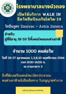 รพ.บางบัวทอง เปิด WALK-IN ฉีดวัคซีนโควิด 19 เข็ม 1 สำหรับประชาชนทั่วไป อายุ 18 – 59 ปี