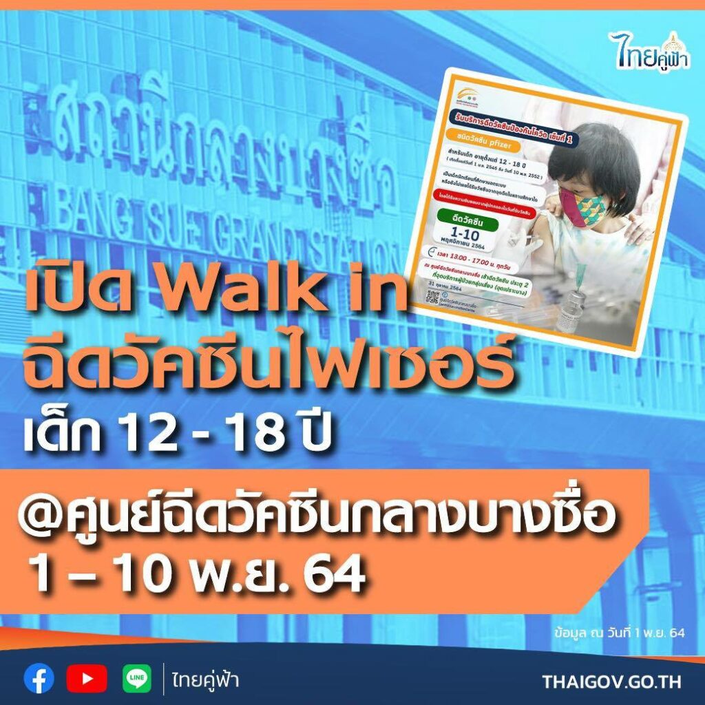 ศูนย์ฉีดวัคซีนกลางบางซื่อ เปิด Walk in ฉีดวัคซีนไฟเซอร์ เด็ก 12 – 18 ปี @ศูนย์ฉีดวัคซีนกลางบางซื่อ 1 – 10 พฤศจิกายน 2564 เปิดให้บริการ Walk in ฉีดวัคซีนป้องกันโรคโควิด 19 เข็มที่ 1 ชนิดวัคซีนไฟเซอร์ สำหรับเด็กอายุ 12 – 18 ปี (เกิดในช่วง 1 ม.ค. 2546 – 10 พ.ย. 2552) ที่ยังไม่เคยได้รับวัคซีนโควิด 19 มาก่อน