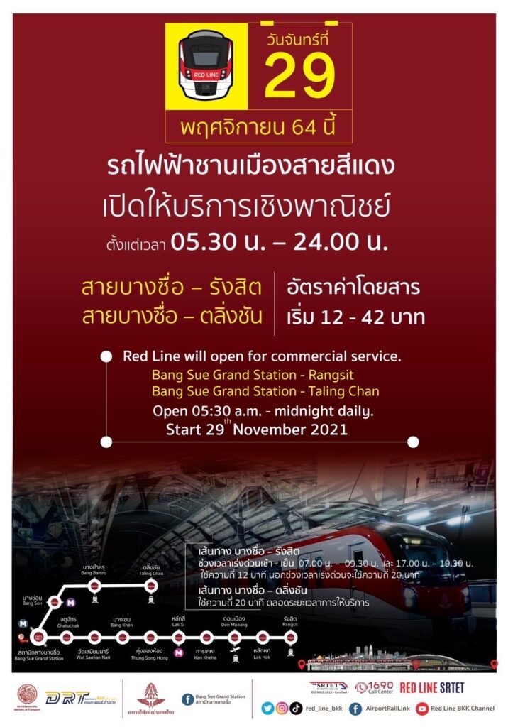 บริษัท รถไฟฟ้า ร.ฟ.ท. จำกัด เตรียมเปิดให้บริการเชิงพาณิชย์รถไฟฟ้าชานเมืองสายสีแดงวันที่ 29 พฤศจิกายน 2564 ทั้ง 2 เส้นทาง คือ สายบางซื่อ – รังสิต และ สายบางซื่อ – ตลิ่งชัน