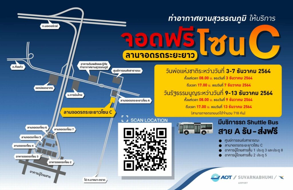 สนามบินสุวรรณภูมิ เปิดให้จอดรถฟรี ที่ลานจอดรถยนต์ระยะยาวโซน C กว่า 700 คัน ในช่วงวันหยุดยาว วันพ่อแห่งชาติ วันที่ 3 – 7 ธันวาคม 2564 และวันรัฐธรรมนูญ วันที่ 9 – 13 ธันวาคม 2564 พร้อมจัดรถ Shuttle Bus สาย A วิ่งรับ – ส่งผู้โดยสารฟรี ตลอด 24 ชม.