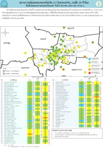 กรมควบคุมมลพิษ รายงานสถานการณ์ฝุ่นละออง PM2.5 พื้นที่กรุงเทพฯ และปริมณฑล ประจำวันที่ 6 ธันวาคม 2564 ณ เวลา 07.00 น. ปริมาณฝุ่นละออง PM2.5 ตรวจวัดค่าได้ระหว่าง 26 – 52 มคก./ลบ.ม. (ค่ามาตรฐานไม่เกิน 50 ไมโครกรัมต่อลูกบาศก์เมตร) โดยพบปริมาณค่าฝุ่นละออง PM2.5 เกินเกณฑ์มาตรฐาน อยู่ในระดับ เริ่มมีผลกระทบต่อสุขภาพ 2 พื้นที่ (สีส้ม)