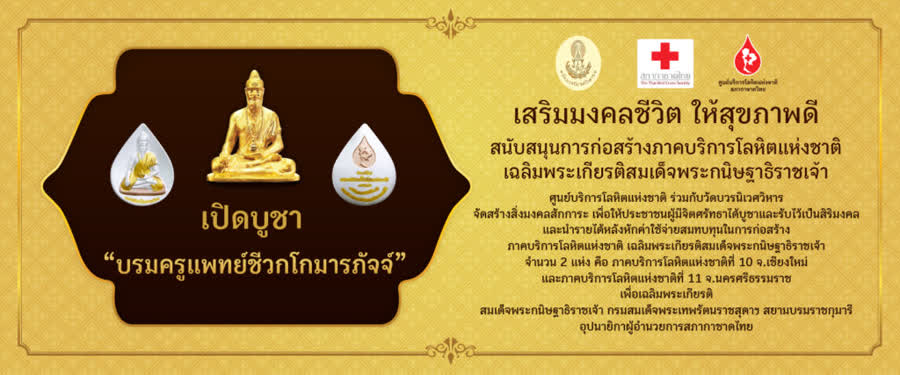 ศูนย์บริการโลหิตแห่งชาติ สภากาชาดไทย ได้จัดสร้างสิ่งมงคลสักการะ “บรมครูแพทย์ชีวกโกมารภัจจ์” โดยการอุปถัมภ์จากวัดบวรนิเวศวิหาร เพื่อให้ผู้มีจิตศรัทธาได้บูชาเสริมมงคลชีวิต ให้สุขภาพดี โดยรายได้หลังหักค่าใช้จ่ายสนับสนุนทุนในการก่อสร้าง “อาคารภาคบริการโลหิตแห่งชาติ เฉลิมพระเกียรติสมเด็จพระกนิษฐาธิราชเจ้า”