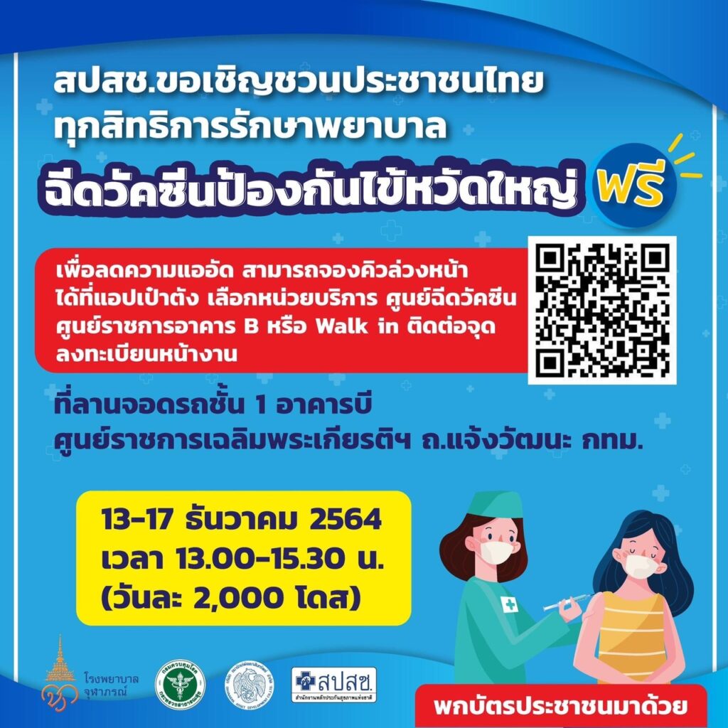 สำนักงานหลักประกันสุขภาพแห่งชาติ (สปสช.) เชิญชวนประชาชนทุกสิทธิการรักษาเข้ารับการฉีดวัคซีนป้องกันไข้หวัดใหญ่ โดยไม่เสียค่าใช้จ่าย ณ ลานจอดรถชั้น 1 อาคารบี ศูนย์ราชการเฉลิมพระเกียรติฯ ถนนแจ้งวัฒนะ กทม. ในช่วงวันที่ 13 – 17 ธันวาคม 2564 เวลา 13.00 – 15.30 น. (ให้บริการวันละ 2,000 โดส)