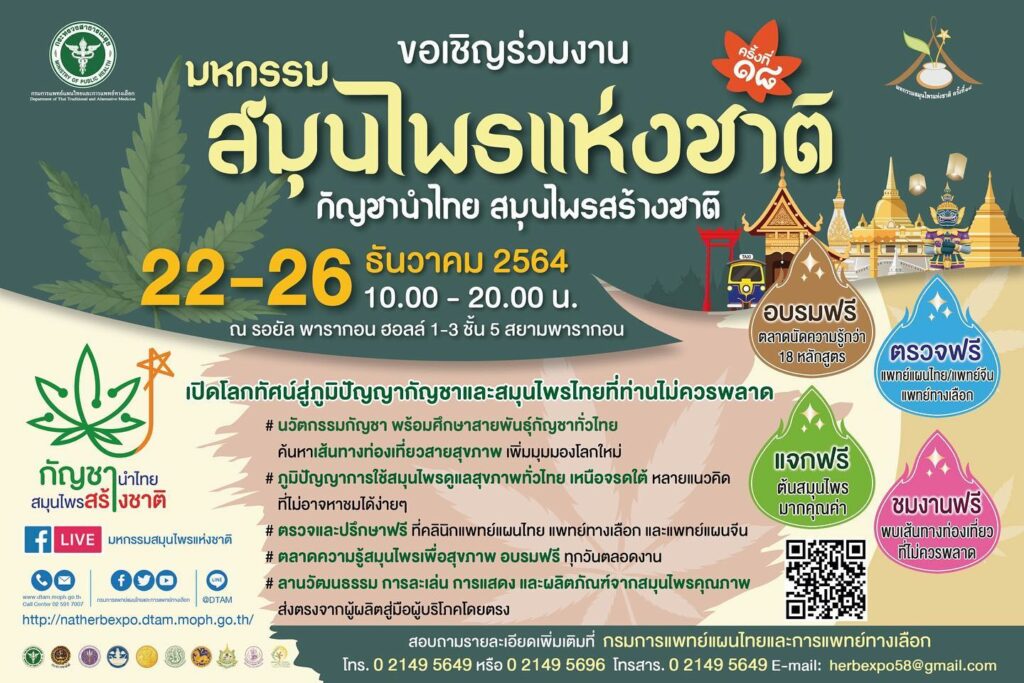 กระทรวงสาธารณสุข ขอเชิญร่วมงานมหกรรมสมุนไพรแห่งชาติ กัญชานำไทย สมุนไพรสร้างชาติ วันที่ 22 – 26 ธันวาคม 2564 เวลา 10.00 – 20.00 น. ณ รอยัล พารากอน ฮอลล์ 1-3 ชั้น 5 สยามพารากอน