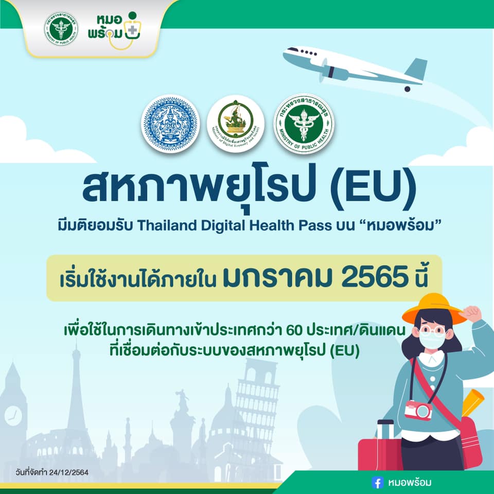 หมอพร้อม เปิดเผยสหภาพยุโรป มีมติยอมรับ Thailand Digital Health Pass บนหมอพร้อม ข่าวสารกิจกรรม, ข่าวไวรัสโควิด-19 หมอพร้อม เปิดเผยสหภาพยุโรป มีมติยอมรับ Thailand Digital Health Pass บนหมอพร้อม หมอพร้อม เปิดเผยสหภาพยุโรป (EU) มีมติยอมรับ Thailand Digital Health Pass บน “หมอพร้อม” เริ่มใช้งานได้ภายใน “มกราคม 2565” นี้ เพื่อใช้ในการเดินทางเข้าประเทศกว่า 60 ประเทศ/ดินแดน ที่เชื่อมต่อระบบกับ EU ที่มา : https://bit.ly/3EtjGU6 Post Views: 20 FacebookFacebookXTwitterLINELine