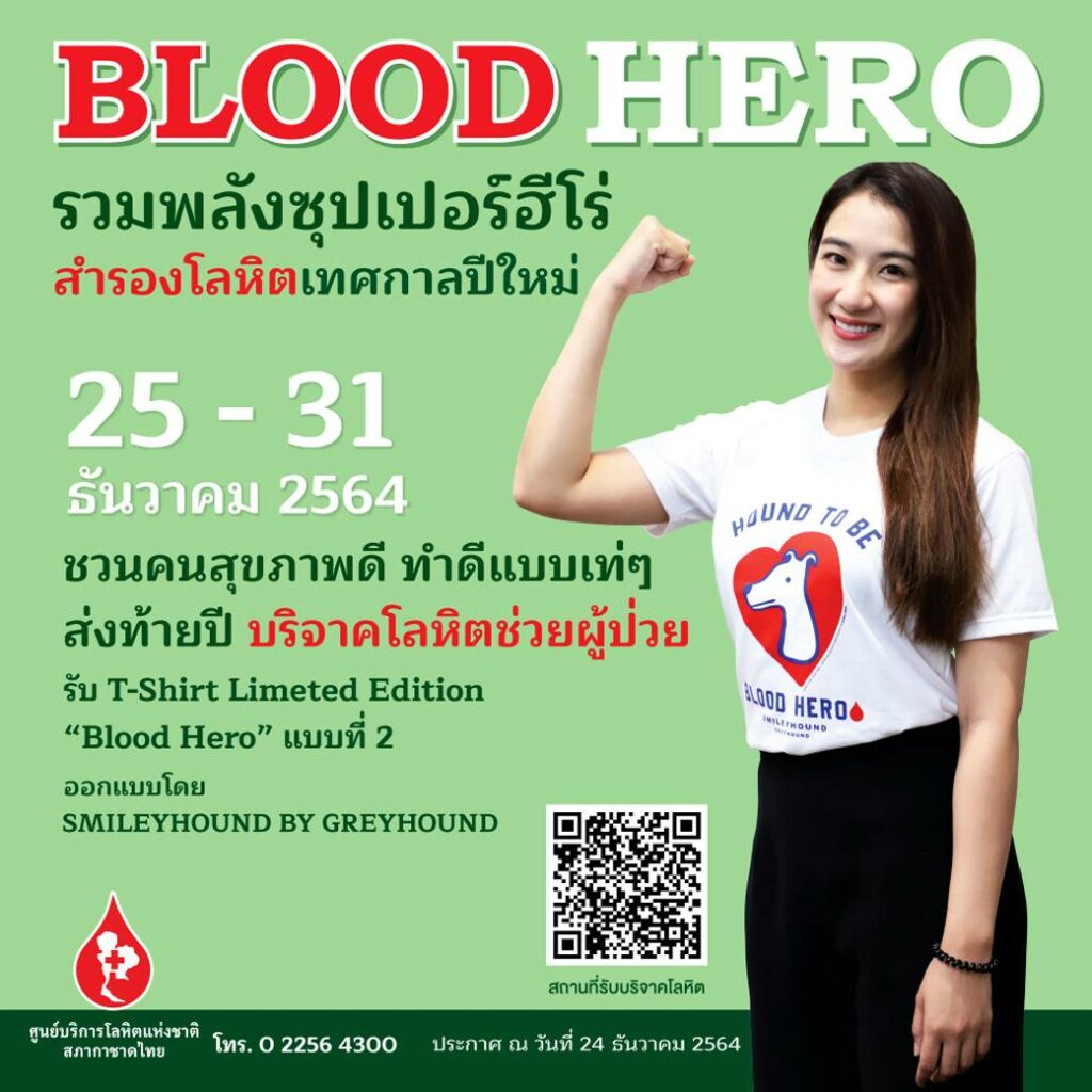 ศูนย์บริการโลหิตแห่งชาติ ขอเชิญชวนเหล่าซุปเปอร์ฮีโร่ ที่มีสุขภาพแข็งแรง รวมพลังบริจาคโลหิตส่งท้ายปี เพื่อสำรองโลหิตให้โรงพยาบาลทั่วประเทศ และผู้ป่วยโรคเลือดที่จำเป็นต้องใช้โลหิต รับเสื้อยืด “BLOOD HERO” แบบที่ 2 ออกแบบโดย SMILEYHOUND BY GREYHOUND ระหว่างวันที่ 25 – 31 ธันวาคม 2564 ดังนี้