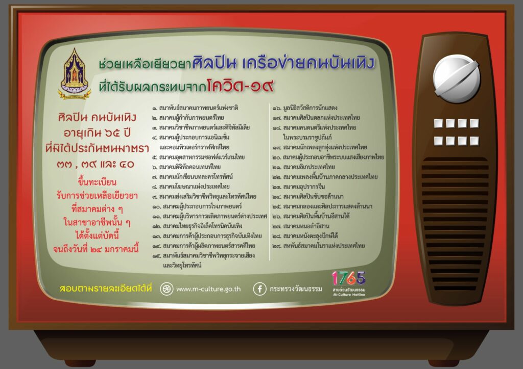 กระทรวงวัฒนธรรม ประสาน 29 สมาคมกลุ่มศิลปินและกลุ่มเครือข่ายอุตสาหกรรมบันเทิง เปิดให้ผู้ที่มีอายุเกิน 65 ปี ทั้งที่เป็นสมาชิกและไม่ได้เป็นสมาชิก สามารถแจ้งความประสงค์เพื่อขึ้นทะเบียนรับการช่วยเหลือเยียวยาผลกระทบจากโควิด 19ผ่านสมาคมกลุ่มศิลปินและกลุ่มเครือข่ายอุตสาหกรรมบันเทิง ทั้งหมด 29 สมาคม ในสาขาอาชีพนั้นๆ ตั้งแต่บัดนี้จนถึงวันที่ 24 มกราคม 2565