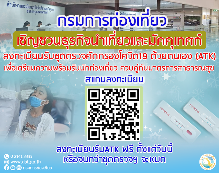 กรมการท่องเที่ยว ขอเชิญชวนผู้ประกอบธุรกิจนำเที่ยวและมัคคุเทศก์ ลงทะเบียนรับชุดตรวจคัดกรองเชื้อโควิด 19 ด้วยตนเอง (ATK) เพื่อสนับสนุนการดำเนินกิจการและกิจกรรมด้านการท่องเที่ยว รองรับการเปิดพื้นที่ด้านการท่องเที่ยว ควบคู่กับการกำหนดมาตรการควบคุมและป้องกันโรคให้เป็นไปตามมาตรฐานความปลอดภัยด้านสาธารณสุข เพื่อป้องกันการแพร่ระบาดของโรคโควิด 19