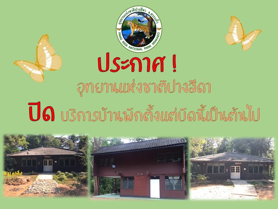 อุทยานแห่งชาติปางสีดา แจ้งปิดให้บริการบ้านพักตั้งแต่บัดนี้เป็นต้นไป ( ลานกางเต็นท์เปิดปกติ )​ เนื่องจากอยู่ระหว่างการพัฒนาถนนลาดยางเข้าบ้านพัก ขออภัยในความไม่สะดวกด้วยค่ะ
