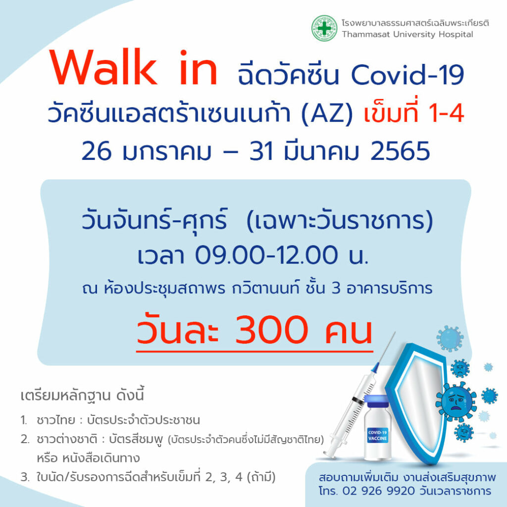 โรงพยาบาลธรรมศาสตร์เฉลิมพระเกียรติ เปิดรับ Walk in ฉีดวัคซีน แอสตราเซนเนกา (AZ) ข่าวสารกิจกรรม, ข่าวไวรัสโควิด-19 โรงพยาบาลธรรมศาสตร์เฉลิมพระเกียรติ เปิดรับ Walk in ฉีดวัคซีน แอสตราเซนเนกา (AZ) โรงพยาบาลธรรมศาสตร์เฉลิมพระเกียรติ เปิดรับ Walk in ฉีดวัคซีน แอสตราเซนเนกา (AZ) เข็มที่ 1 – 4 วันละ 300 คน ตั้งแต่วันที่ 26 มกราคม – 31 มีนาคม 2565 วันจันทร์ – ศุกร์ (เว้นวันหยุดราชการ) ที่มา : https://bit.ly/3qVQzp5 Post Views: 142 FacebookFacebookXTwitterLINELine