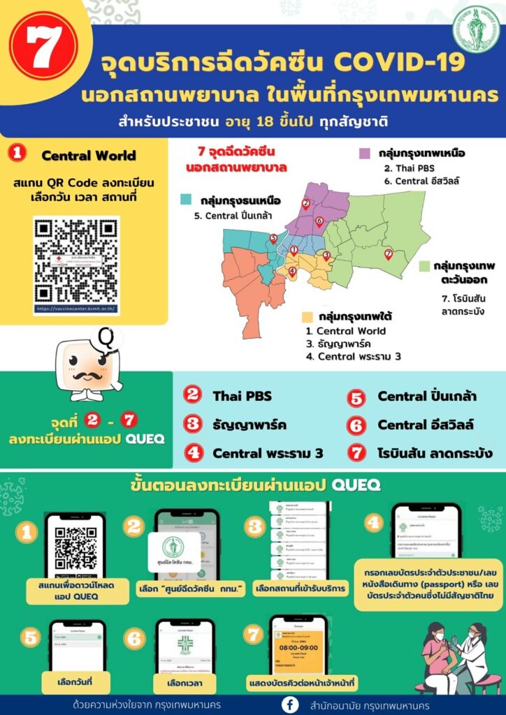 กรุงเทพมหานคร เปิด 7 จุดบริการฉีดวัคซีน COVID-19 นอกสถานพยาบาล ในพื้นที่ กทม. สำหรับประชาชนอายุ 18 ปีขึ้นไป ทุกสัญชาติ