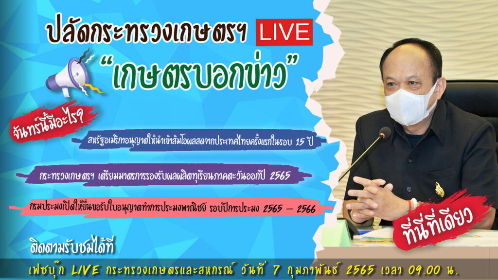 กระทรวงเกษตรและสหกรณ์ ขอเรียนเชิญติดตามรับชมรายการเกษตรบอกข่าว ในวันจันทร์ที่ 7 กุมภาพันธ์ 2565 ออกอากาศเวลา 09.00 น. โดย ดร. ทองเปลว กองจันทร์ ปลัดกระทรวงเกษตรและสหกรณ์
