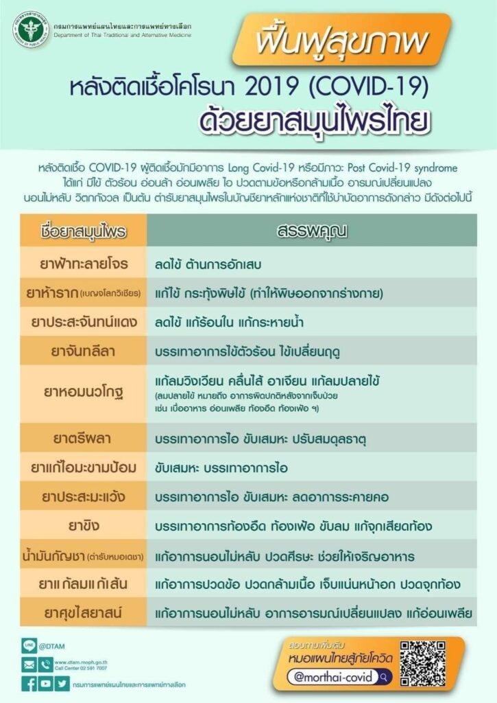 กรมการแพทย์แผนไทยและการแพทย์ทางเลือก กระทรวงสาธารณสุข แนะยาสมุนไพรไทย สำหรับฟื้นฟูสุขภาพ หลังติดเชื้อโควิด 19 ซึ่งผู้ติดเชื้อมักมีอาการลองโควิด (Long Covid-19) หรืออาการที่ตามมาหลังจากหายป่วยโควิด เช่น มีไข้ ตัวร้อน อ่อนล้า อ่อนเพลีย ไอ ปวดตามข้อหรือกล้ามเนื้อ อารมณ์เปลี่ยนแปลง นอนไม่หลับ วิตกกังวล เป็นต้น สอบถามเพิ่มเติมได้ที่ ไลน์หมอแผนไทยสู้ภัยโควิด @morthai-covid