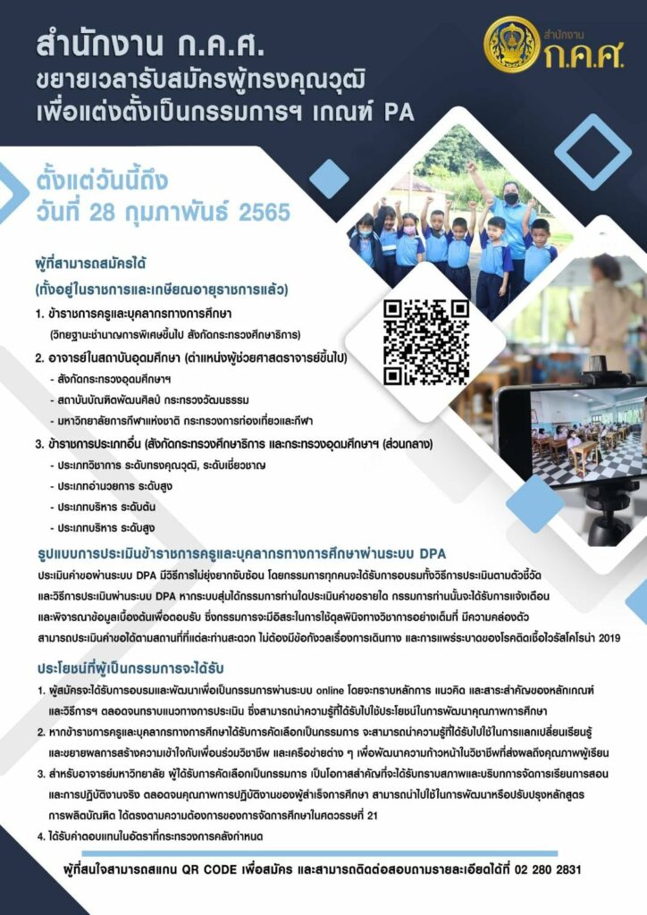 สำนักงาน ก.ค.ศ. ขยายเวลารับสมัครผู้ทรงคุณวุฒิ เพื่อแต่งตั้งเป็นกรรมการฯ เกณฑ์ PA ตั้งแต่วันนี้ – 28 ก.พ. 65 ผู้ที่สามารถสมัครได้ ทั้งอยู่ในราชการ และเกษียณอายุราชการแล้ว ถ้าเป็นข้าราชการครูและบุคลากรทางการศึกษา ต้องระดับชำนาญการพิเศษขึ้นไป ในสังกัด ศธ. หรือเป็นอาจารย์ในสถาบันอุดมศึกษา ตำแหน่ง ผศ. ขึ้นไป หรือข้าราชการประเภทอื่น สังกัดกระทรวงศึกษาธิการ หรือกระทรวงการอุดมศึกษาฯ