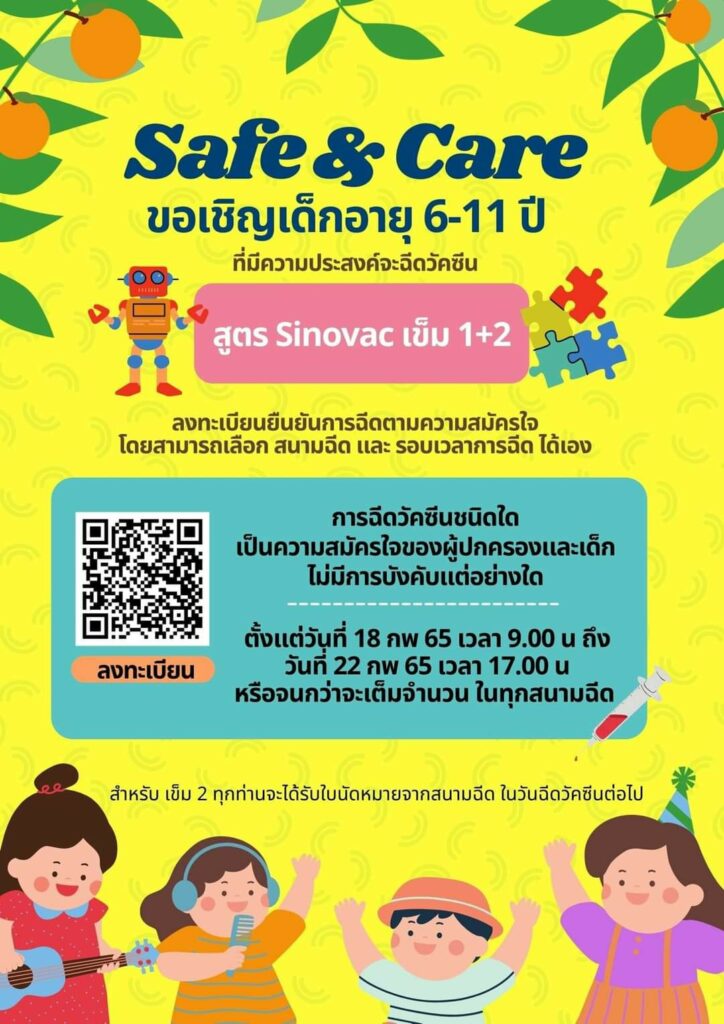 จังหวัดนนทบุรี ขอเชิญเด็กอายุ 6 – 11 ปี ที่มีความประสงค์จะฉีดวัคซีนสูตร Sinovac เข็ม 1 + 2
