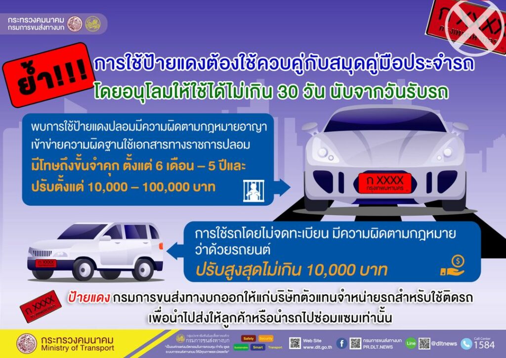 รองอธิบดีกรมการขนส่งทางบก กล่าวเพิ่มเติมว่า การใช้ป้ายแดงจะต้องใช้คู่กับสมุดคู่มือประจำรถโดยอนุโลมให้ใช้ป้ายแดงเป็นการชั่วคราวไม่เกิน 30 วัน นับจากวันรับรถ หากเจ้าของรถนำป้ายแดงไปใช้เกินกว่าระยะเวลาที่กำหนดโดยไม่ดำเนินการนำรถไปจดทะเบียนให้แล้วเสร็จ ถือว่ามีความผิดตามกฎหมายว่าด้วยรถยนต์ ฐานใช้รถโดยไม่จดทะเบียน มีโทษปรับสูงสุดไม่เกิน 10,000 บาท นอกจากนี้ หากรถยนต์ถูกโจรกรรมจะยากต่อ การติดตามตรวจสอบ จึงแนะนำให้ผู้ที่ซื้อรถใหม่เร่งนำรถมาจดทะเบียนให้ถูกต้อง ณ กรมการขนส่งทางบก หรือสำนักงานขนส่งจังหวัดโดยเร็ว
